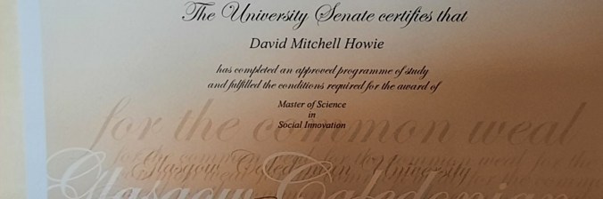 I graduated from the OU in 2019 with a BA (Hons) PPE. Back to GCU, this time to study Social Innovation. Remember I said I had not learned to write academically in 2014? In 2021, I still had much to learn about academic writing. On reflection, I was accepted into the class because of my unpaid experience in Scotland’s third sector, not my academic achievements. After a resit or two, I was allowed to complete my dissertation. My dissertation question answered, “Why is there a subjective well-being premium in voluntary sector employment?”